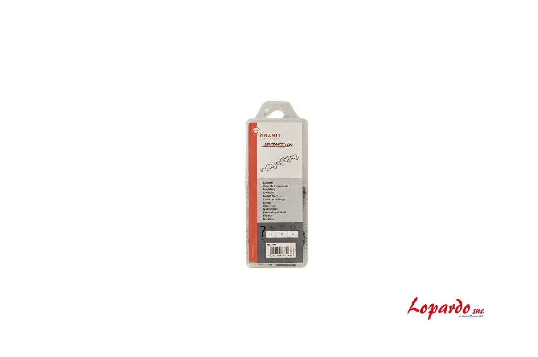 Catena motosega professionale Endurance Cut Granit ad alta resistenza, progettata per la massima durabilità e velocità di taglio. Passo 3/8" LoPro e spessore 1.3mm con 45 maglie di trazione. Presente l'elemento di trasmissione cruciale per la sicurezza, progettato per interrompere o limitare la forza in caso di sovraccarico, prevenendo danni costosi ai componenti della macchina e proteggendo l'operatore. Con un peso di 170g, la speciale forma del dente semitondo offre un taglio netto e veloce, assicurando la massima rimozione del truciolo e prestazioni eccellenti su legni duri. Ideale per uso intensivo e legno duro. Minore usura, maggiore efficienza.