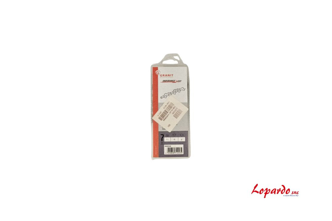 Catena motosega professionale Endurance Cut Granit ad alta resistenza, progettata per la massima durabilità e velocità di taglio. Passo 3/8" LoPro e spessore 1.1mm con 45 maglie di trazione. Presente l'elemento di trasmissione cruciale per la sicurezza, progettato per interrompere o limitare la forza in caso di sovraccarico, prevenendo danni costosi ai componenti della macchina e proteggendo l'operatore. Con un peso di 150g, La speciale forma del dente semitondo offre un taglio netto e veloce, assicurando la massima rimozione del truciolo e prestazioni eccellenti su legni duri. Ideale per uso intensivo e legno duro. Minore usura, maggiore efficienza.