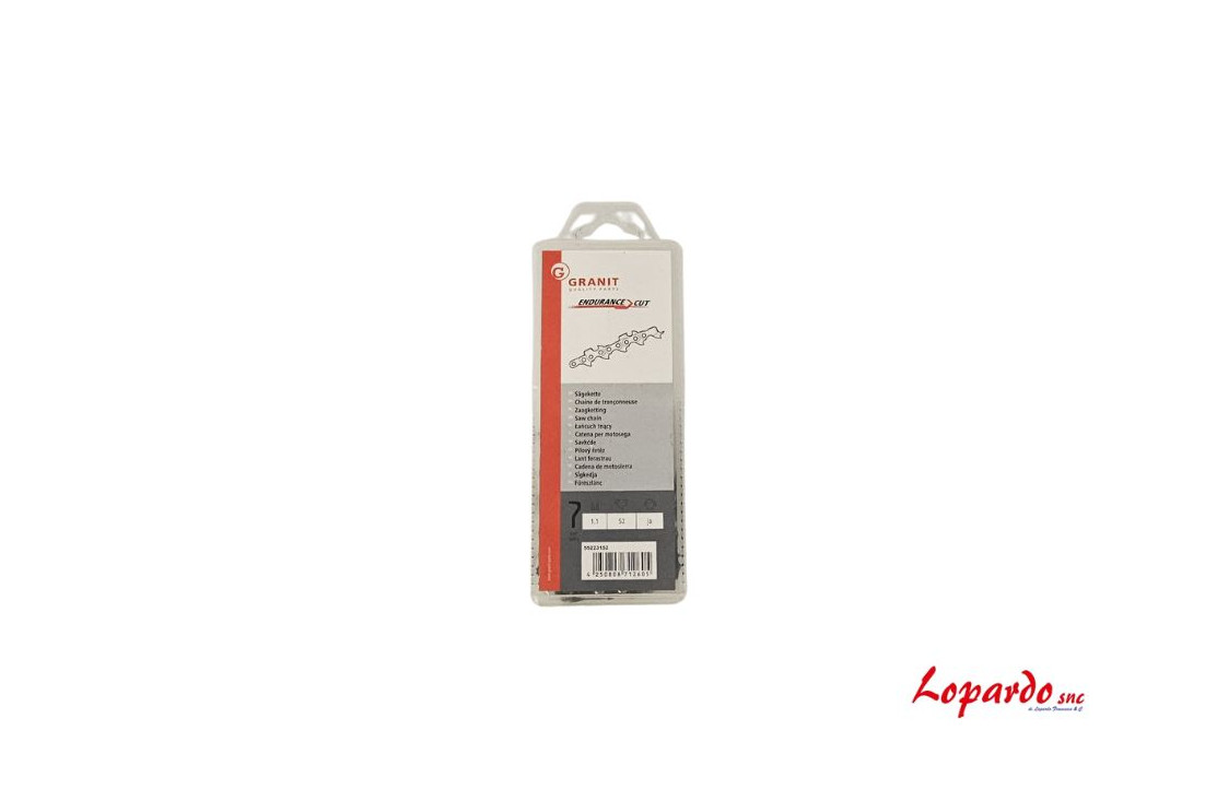 Catena professionale Endurance Cut Granit ad alta resistenza, progettata per la massima durabilità e velocità di taglio. Passo 3/8" LoPro e spessore 1.1mm con 52 maglie di trazione. Presente l'elemento di trasmissione cruciale per la sicurezza, progettato per interrompere o limitare la forza in caso di sovraccarico, prevenendo danni costosi ai componenti della macchina e proteggendo l'operatore. Con un peso di 166g, La speciale forma del dente semitondo offre un taglio netto e veloce, assicurando la massima rimozione del truciolo e prestazioni eccellenti su legni duri. Ideale per uso intensivo e legno duro. Minore usura, maggiore efficienza.