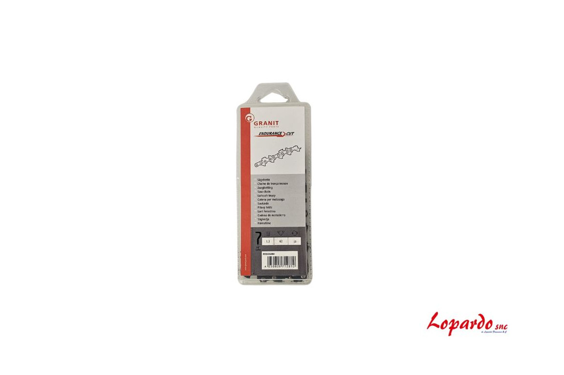 Catena professionale Endurance Cut Granit ad alta resistenza, progettata per la massima durabilità e velocità di taglio. Passo 3/8" LoPro e spessore 1.3mm con 60 maglie di trazione. Presente l'elemento di trasmissione cruciale per la sicurezza, progettato per interrompere o limitare la forza in caso di sovraccarico, prevenendo danni costosi ai componenti della macchina e proteggendo l'operatore. Con un peso di 228g, La speciale forma del dente semitondo offre un taglio netto e veloce, assicurando la massima rimozione del truciolo e prestazioni eccellenti su legni duri. Ideale per uso intensivo e legno duro. Minore usura, maggiore efficienza.