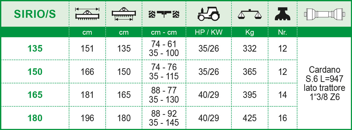 Il Trincia Celli Sirio/S è un potente attrezzo con una potenza di 50 HP (37 KW), ideale per svolgere svariate mansioni in agricoltura. La sua trasmissione avviene attraverso 3 cinghie, mentre la presa di forza opera a 540 giri/min con uno specifico rapporto di 1V: 2454 giri/min.