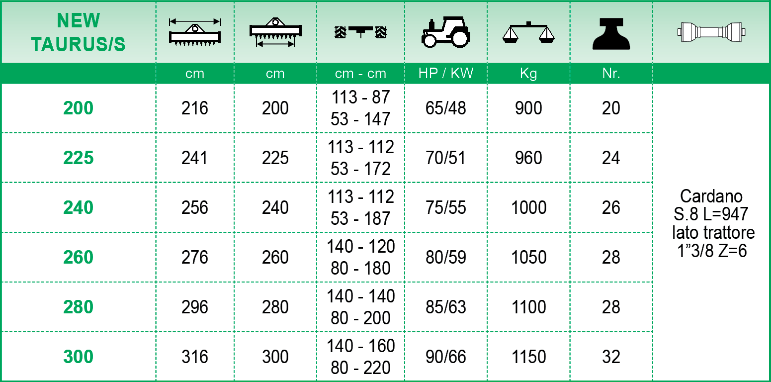 Il nuovo Trincia Celli NEW TAURUS/S è un prodotto potente con una potenza di 120 HP e TRASMISSIONE a 5 cinghie. Dotato di Presa di forza a 540 giri/min 1V e a 2550 giri/min, questo trincia offre una serie di dotazioni di serie come la bocca telaio molto alta, lo spostamento laterale idraulico e i controcoltelli fissi. Ideale per operare con trattori di media potenza, trinciare erba e sarmenti, tagliare legna e molto altro ancora. Accessori a richiesta inclusi ruote autosterzanti e utensili per il rotore. Con il Trincia Celli NEW TAURUS/S avrete prestazioni eccezionali in vigneto e non solo.