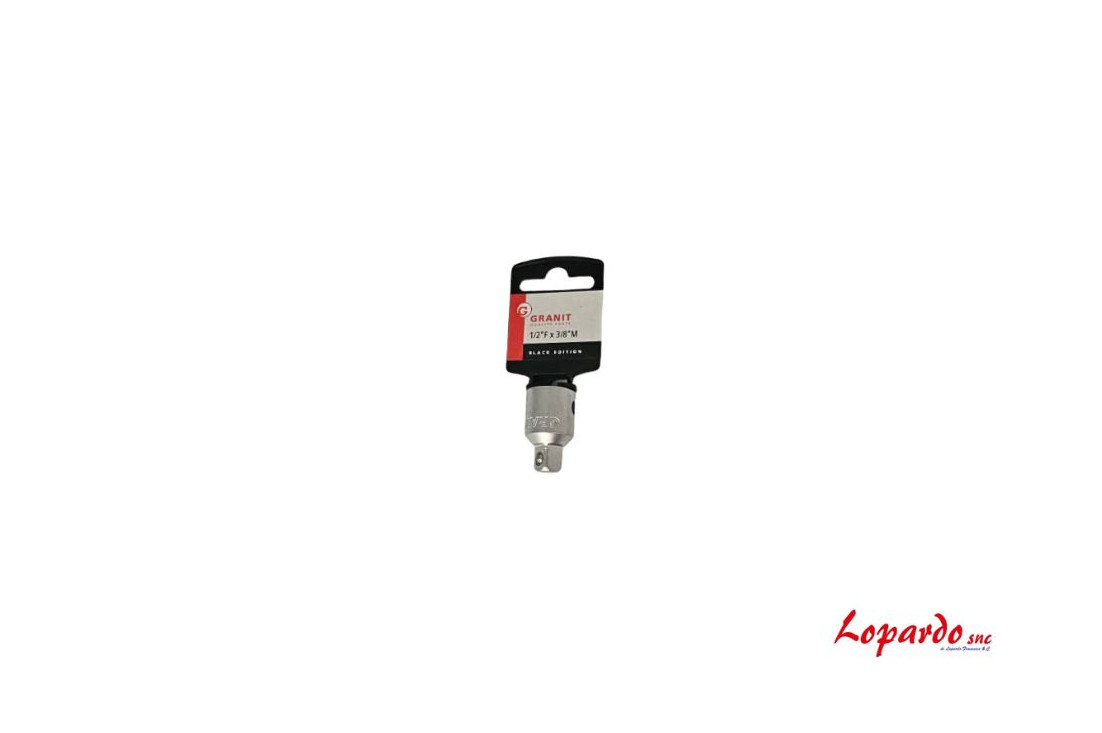 Adattatore professionale Granit black edition in robusto acciaio al cromo-vanadio. Riduce l'attacco da 1/2 pollice femmina a 3/8 di pollice maschio, permettendo di utilizzare bussole 3/8" con cricchetti 1/2". Con un peso di soli 58g presenta una finitura nera anti-corrosione e blocco a sfera per un fissaggio sicuro. Ideale per meccanica e fai da te di precisione.