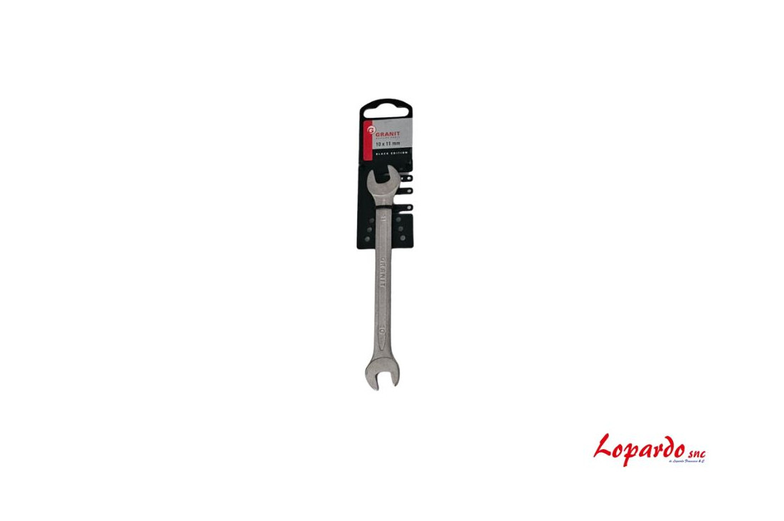 Chiave a forchetta doppia professionale 10x11 mm Granit black edition. Realizzata in robusto acciaio al cromo-vanadio con finitura nera opaca anti-corrosione. Perfetta per serraggi potenti e duraturi in officina, agricoltura e industria. Con una lunghezza compatta di 156mm ed un peso di 60g ben distribuito si conferma la qualità costruttiva e la solidità dei materiali. Ideale per officine, agricoltori e manutentori industriali, aggiungila ai tuoi attrezzi da lavoro oggi stesso.