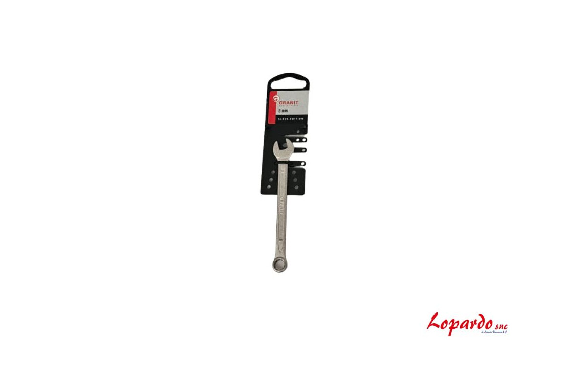 Chiave combinata piegata 8mm Granit black edition, di lunghezza 120mm e 34g potente e maneggevole, di qualità professionale in acciaio Cromo-Vanadio. Ideale per spazi ristretti. Affidabilità e durata. Acquista ora la tua chiave combinata piegata 8mm e aggiungi un elemento di precisione e resistenza alla tua attrezzatura professionale. L'attrezzo indispensabile per professionisti del settore, manutentori e artigiani specializzati.