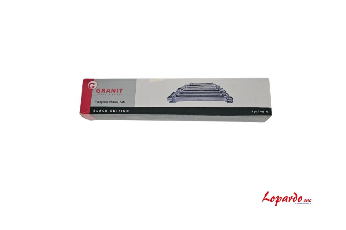 Serie di chiavi combinate XL (Extra Lunghe) Granit Black Edition in robusto acciaio Cr-V. Offrono leva superiore e massima resistenza per lavori gravosi. Design con bocca e anello inclinati a 15° per un accesso ottimale. Con un peso di 3,82kg e una finitura satinata nera anti-corrosione. La serie include 8 pezzi essenziali nelle misure e per il lavoro pesante: 10, 13, 17, 19, 22, 24, 27 e 30 mm. Un must-have per meccanici e professionisti esigenti.